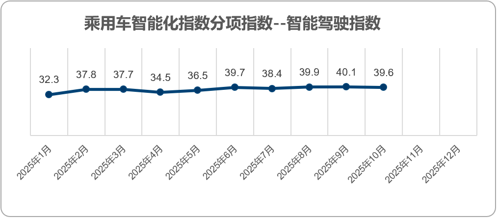 2025年10月,智能驾驶指数39.6,环比下降了0.5个单位,增长趋势放缓。