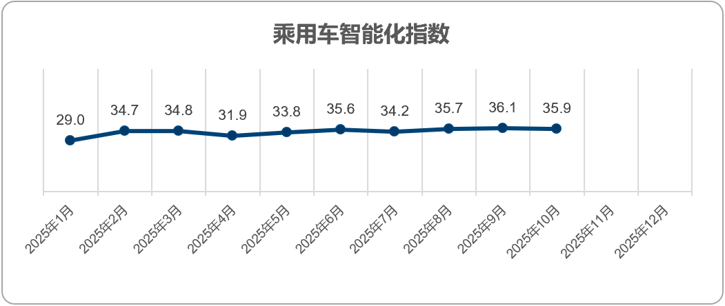 2025年10月乘用车智能化指数为35.9。其中智能座舱指数为38.2;智能驾驶指数为39.6;舱外智能指数为19.4。