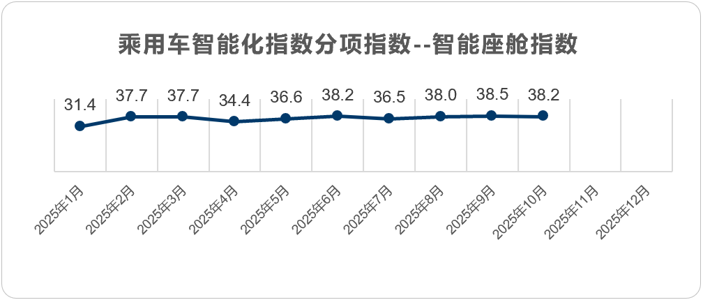 2025年10月,智能座舱指数38.2,环比下降了0.3个单位,出现小幅回调。