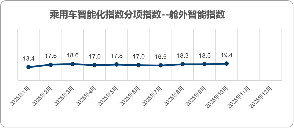 2025年10月,舱外智能指数19.4,环比增长了0.9个单位,整体保持增长趋势。